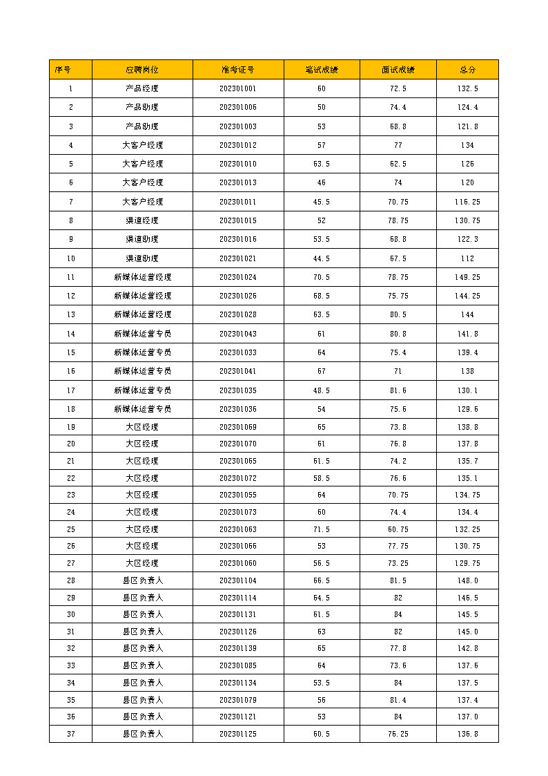 根据《沐鸣2集团2023年大型社会招聘公告》要求和程序,经报名与资格初审、笔试、面试等程序,现将沐鸣2公司管理/技术岗录用人员成绩予以公布。自本公告发布起,3个工作日内,工作人员将以电话、邮箱形式对录用人员逐一通知。